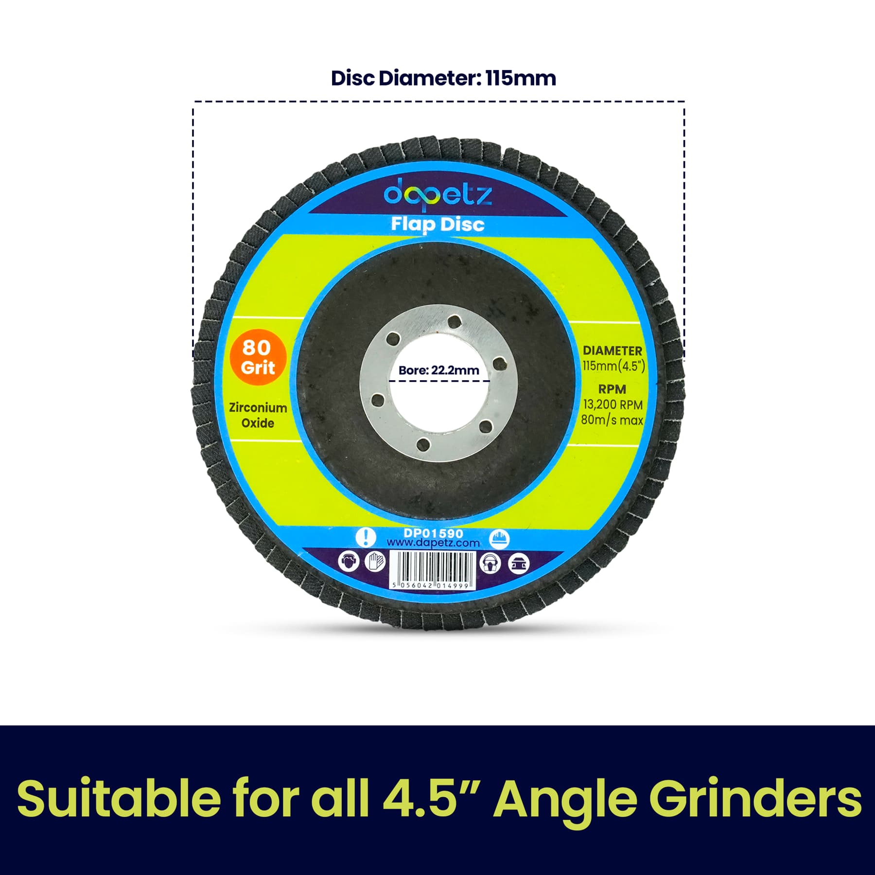 Fits standard angle grinders with a 22.2mm bore.