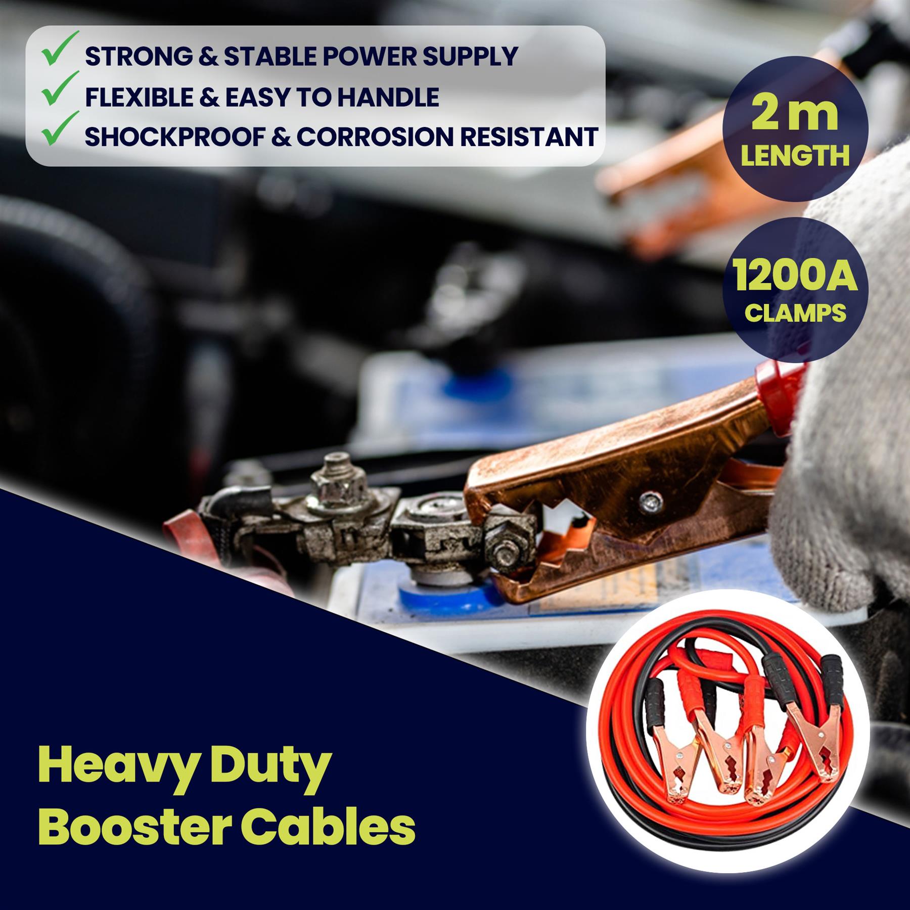 2 Meter 1200amp JUMP Leads Booster Cables Thick Heavy Duty Cable Car Van Truck