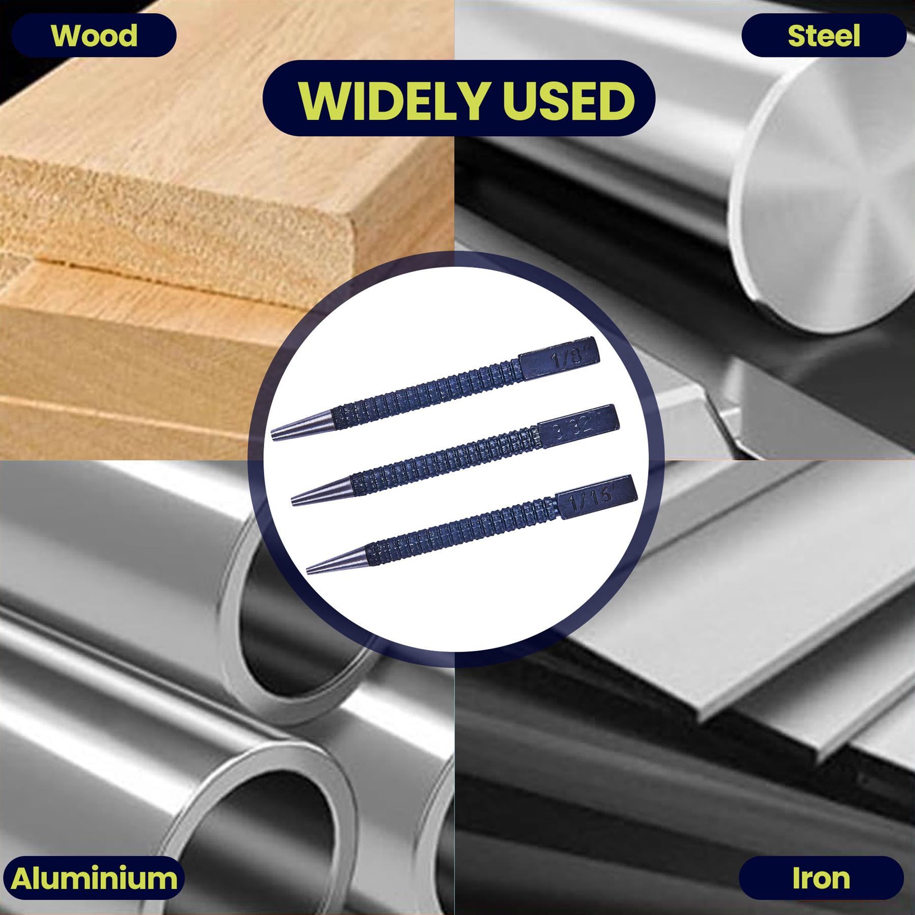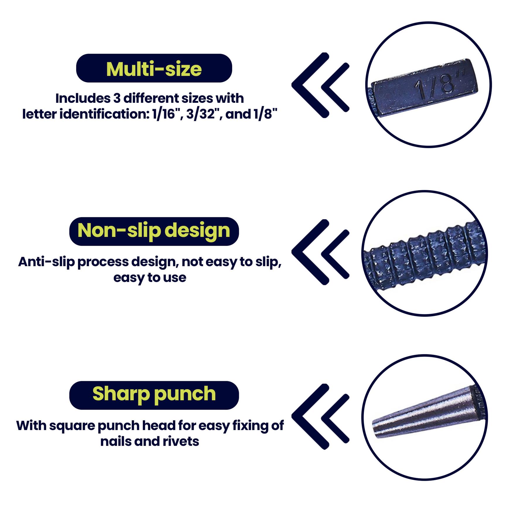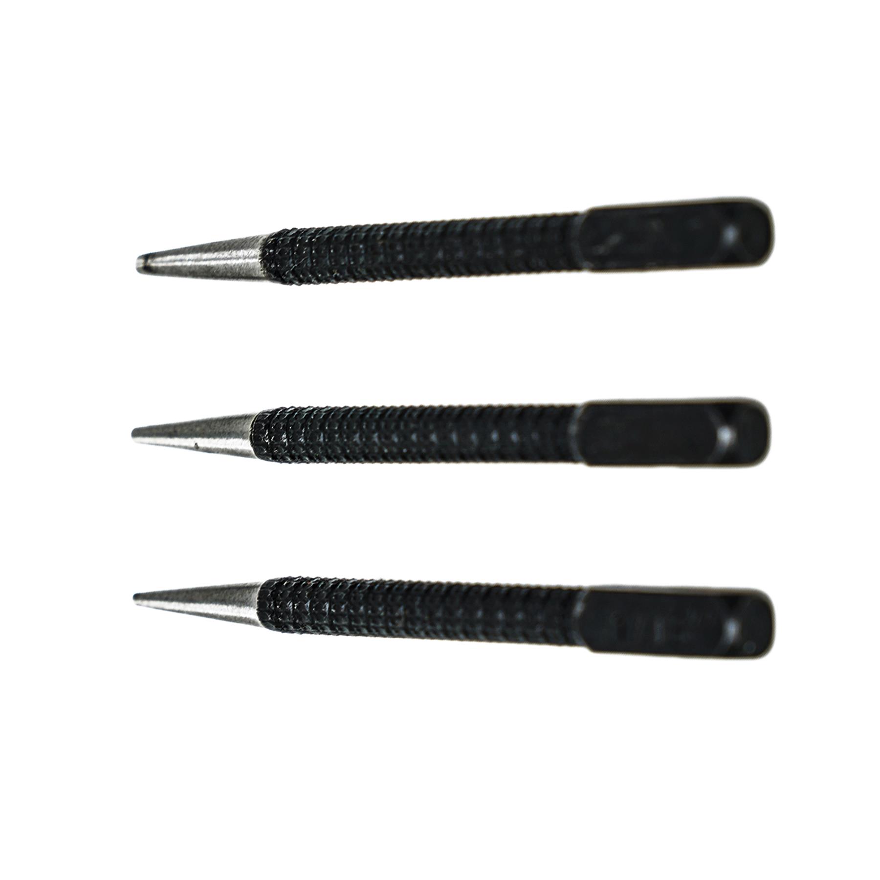 - Versatile Set: Includes three center punches in different sizes: 1/16″, 3/32″, and 1/8″.