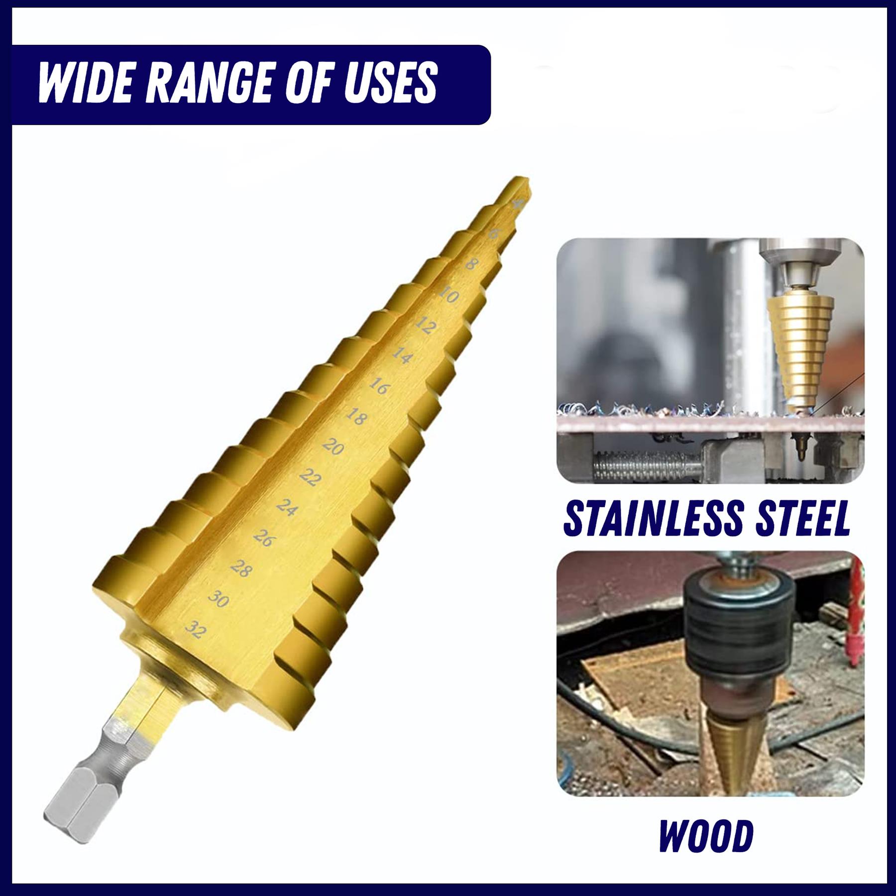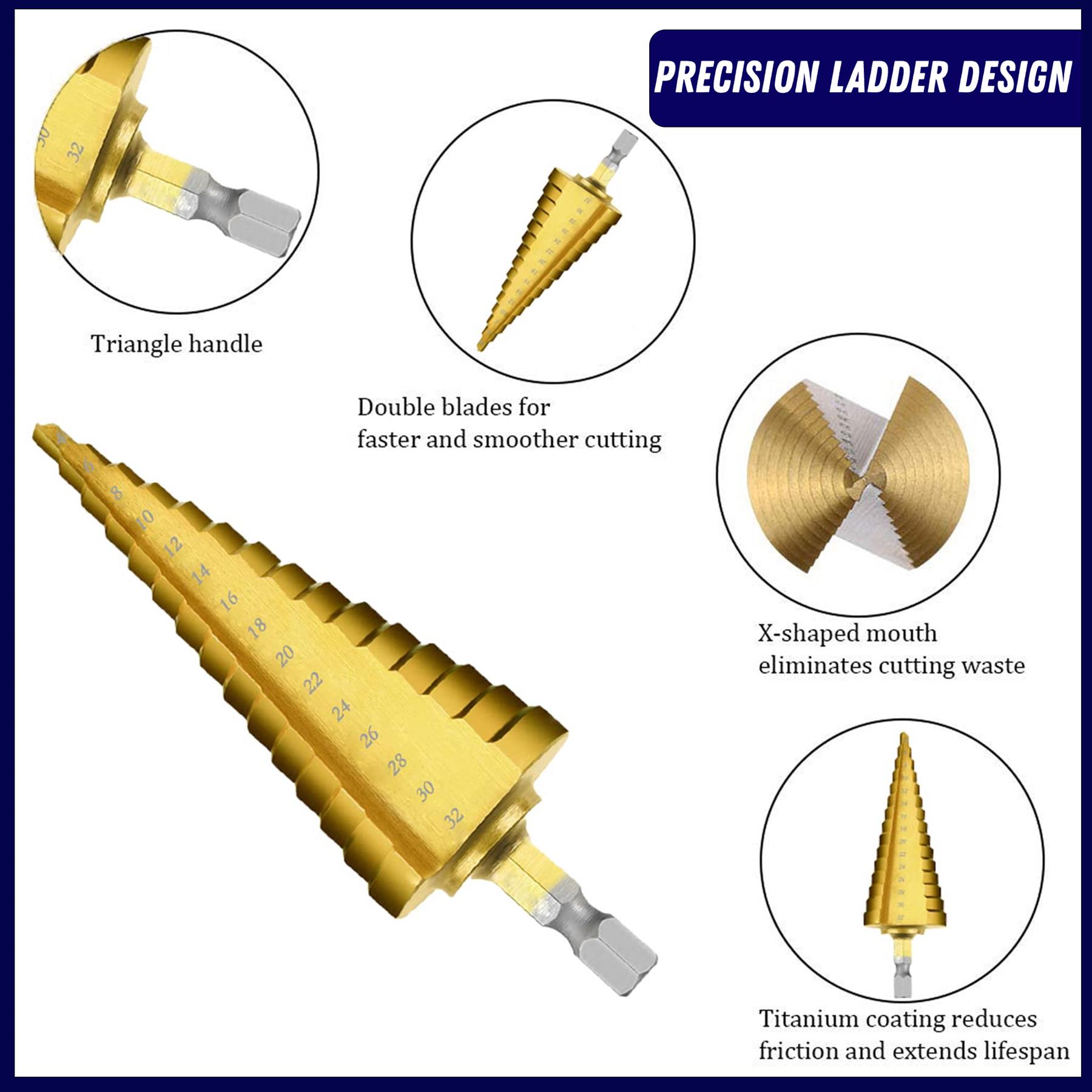 3-Piece Step Drill Bit Set – Includes three step drill bits covering a wide range of hole sizes for versatile applications.
