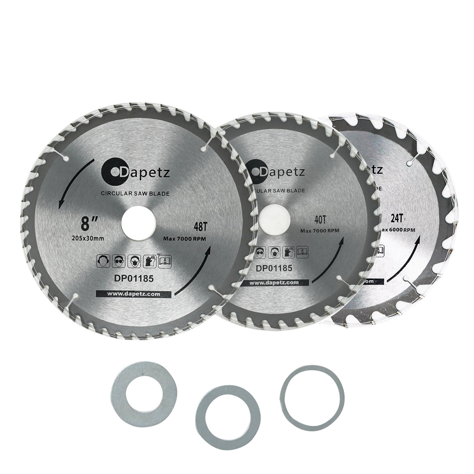 Complete 3-Blade Set – Includes three circular saw blades in 205mm diameter with 24T, 40T, and 48T, covering coarse, medium, and fine cutting needs.