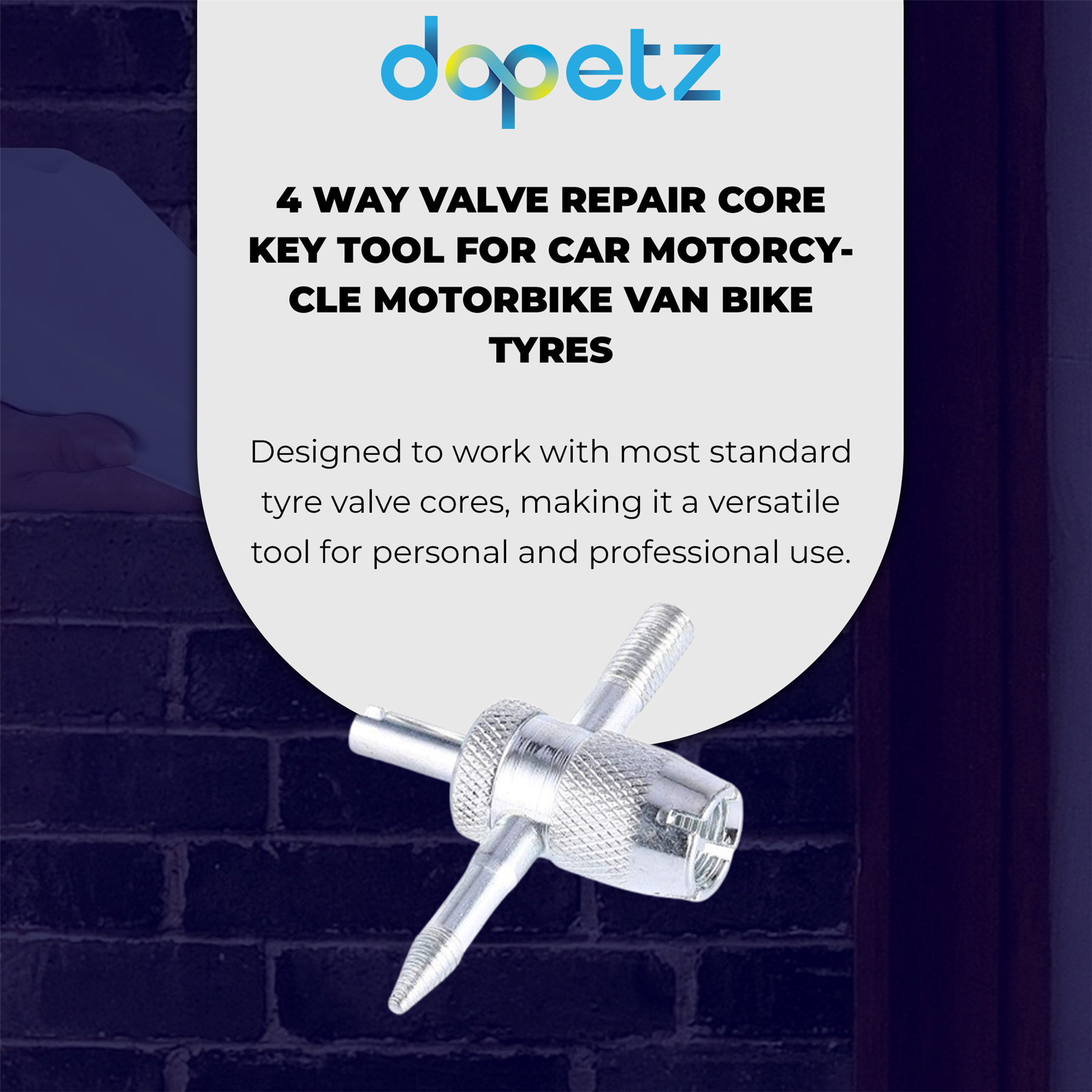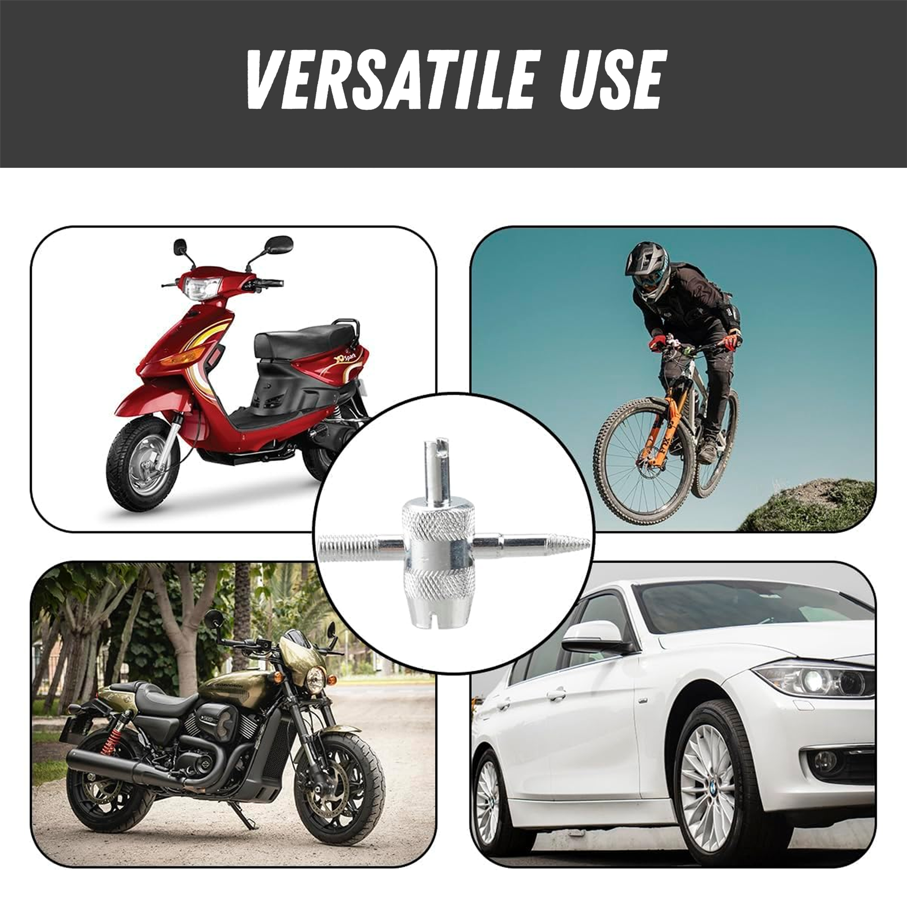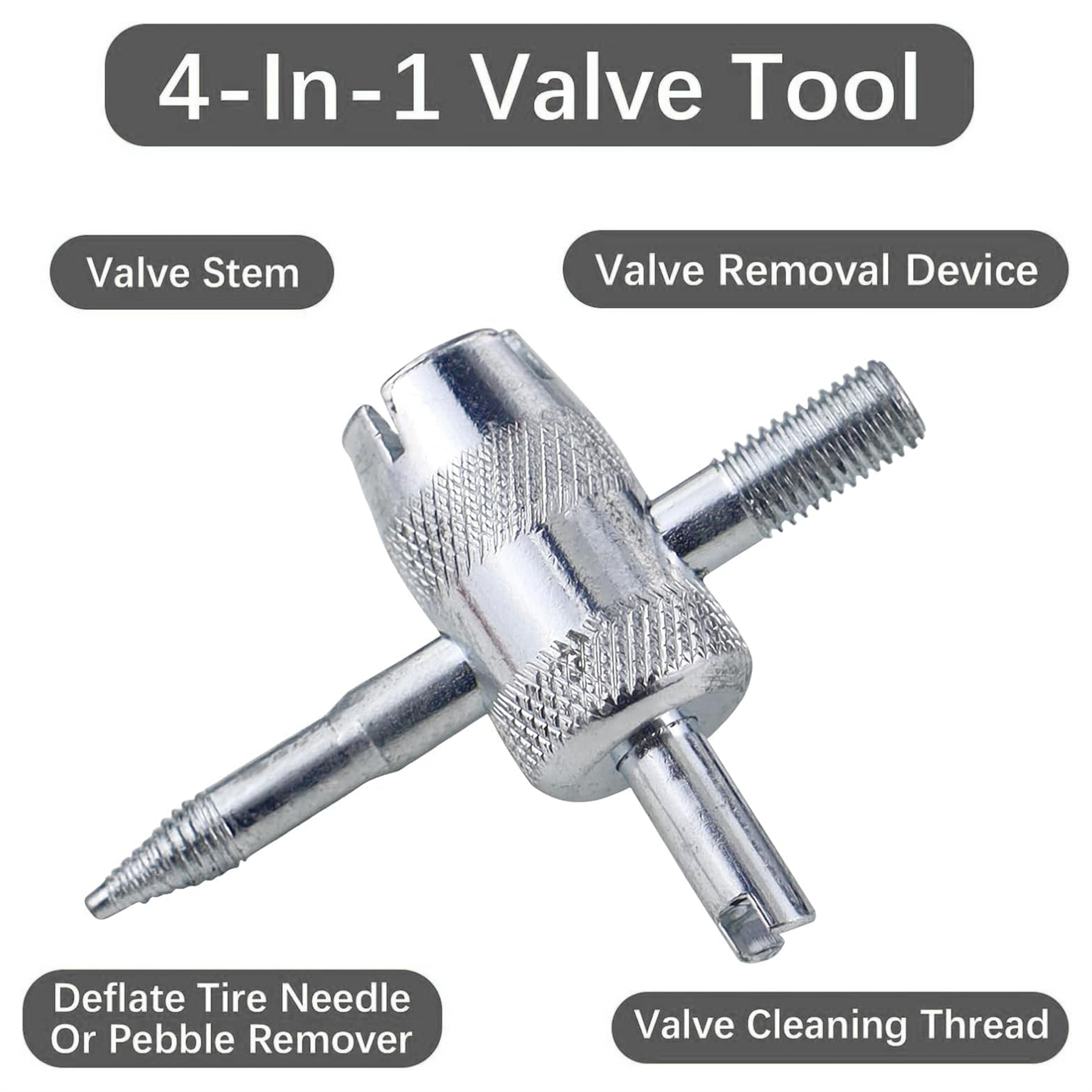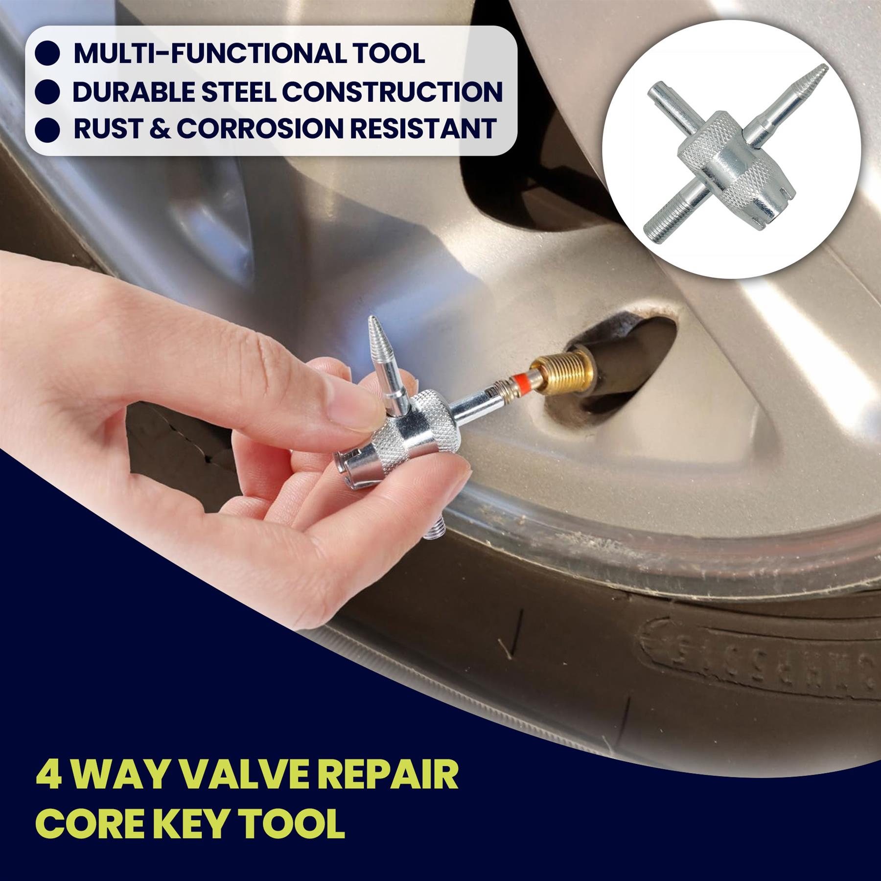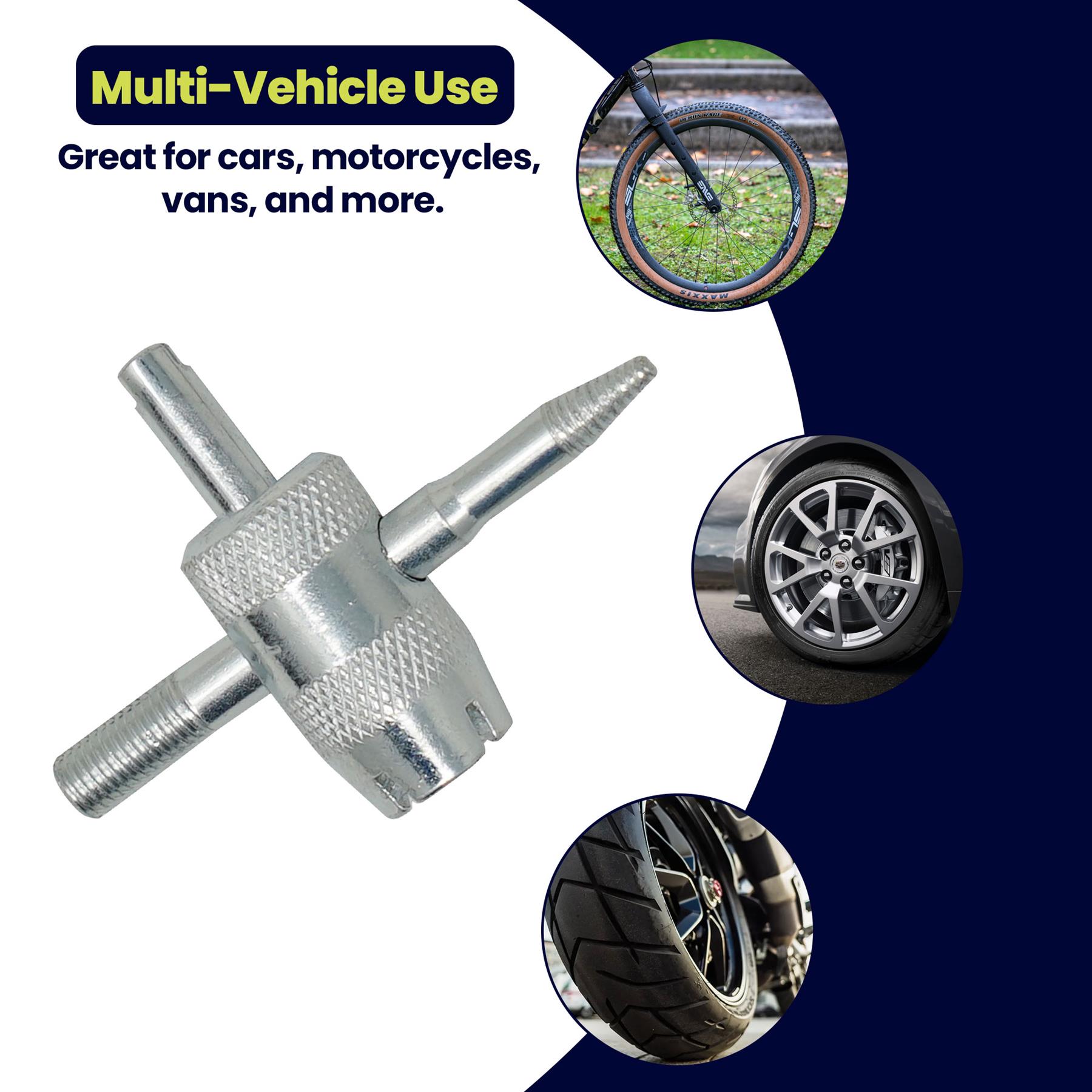 Versatile 4-Way Design – Compatible with multiple valve core sizes for cars, motorcycles, vans, and more.
