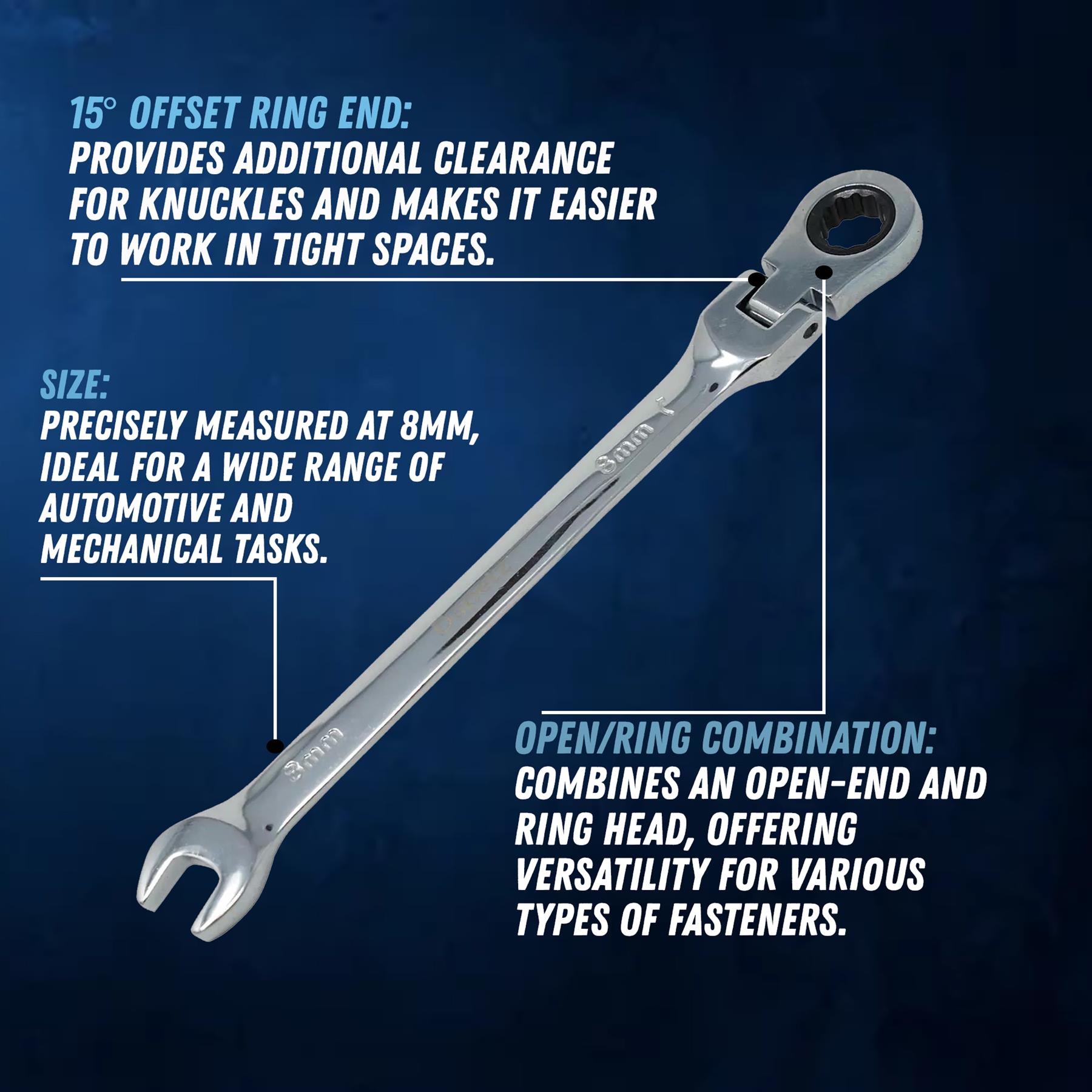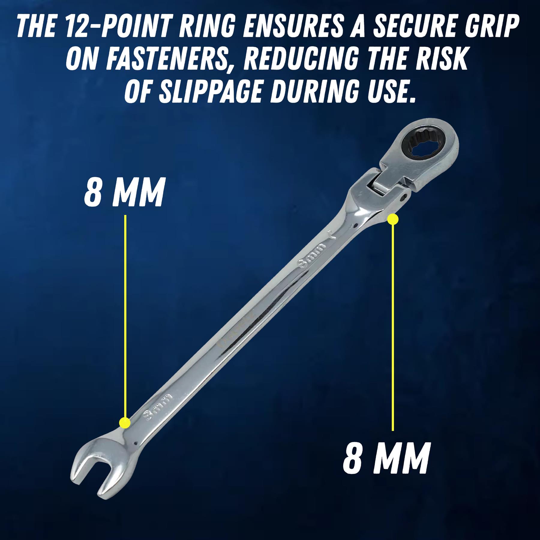Professional 8mm Flexible Head Ratchet Spanner – CRV Chrome Plated, Open & Ring, 12-Point Gear Head