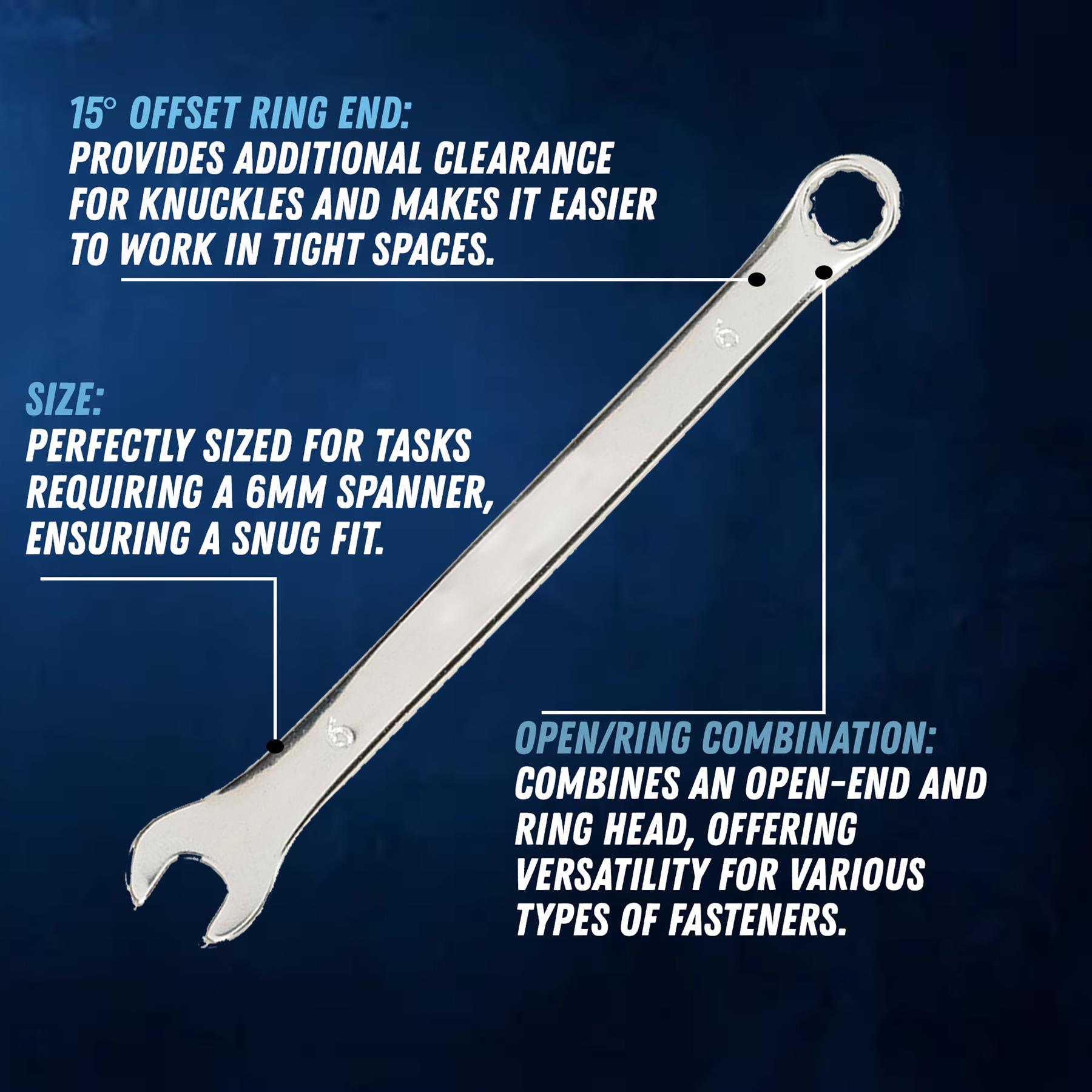 - Upgrade your toolbox with the essential Combination Spanner set, featuring a 6mm size perfect for various tasks in your garage or workshop.