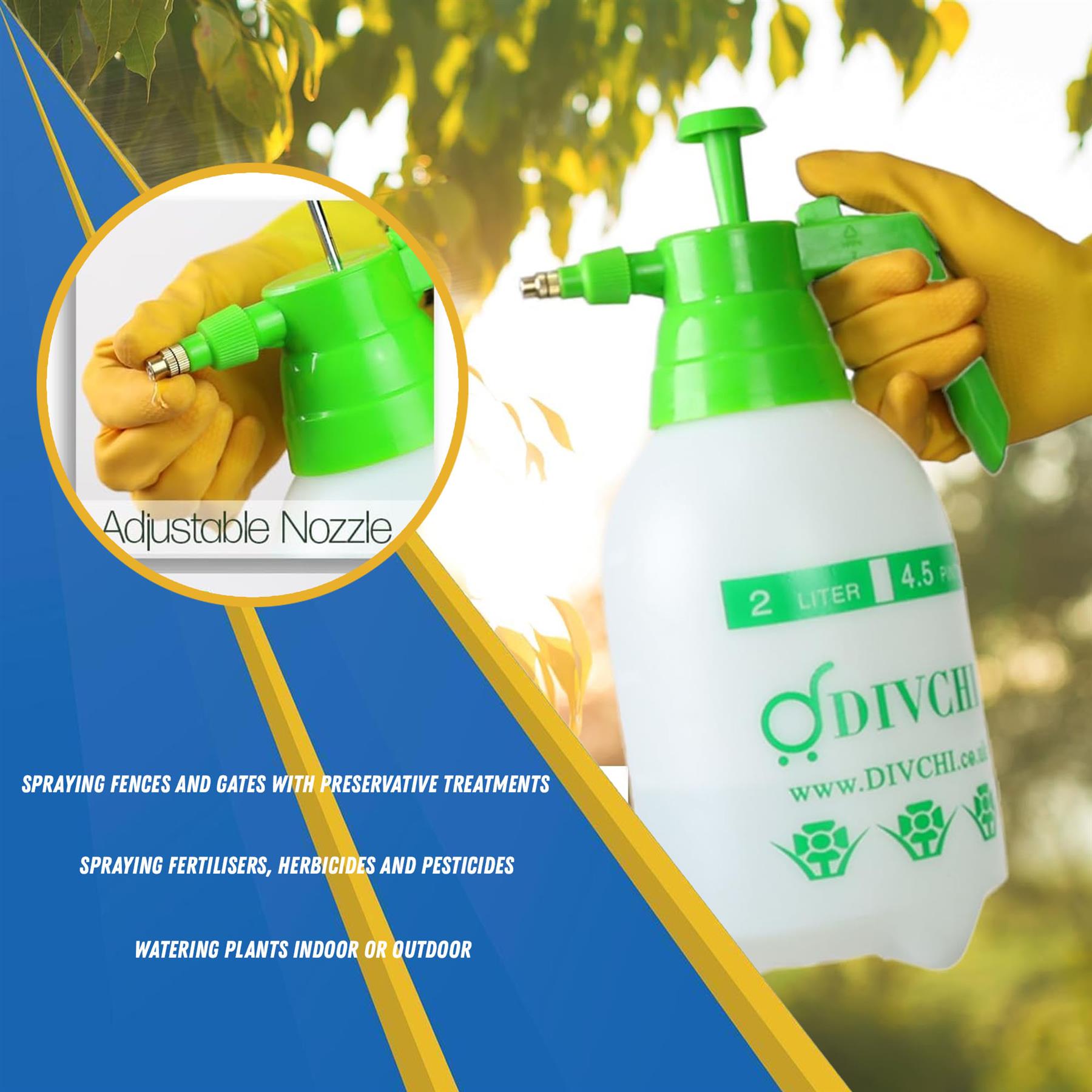 • This 2L pressure sprayer handles numerous applications, from watering plants and applying fertilizers to washing cars and cleaning surfaces.