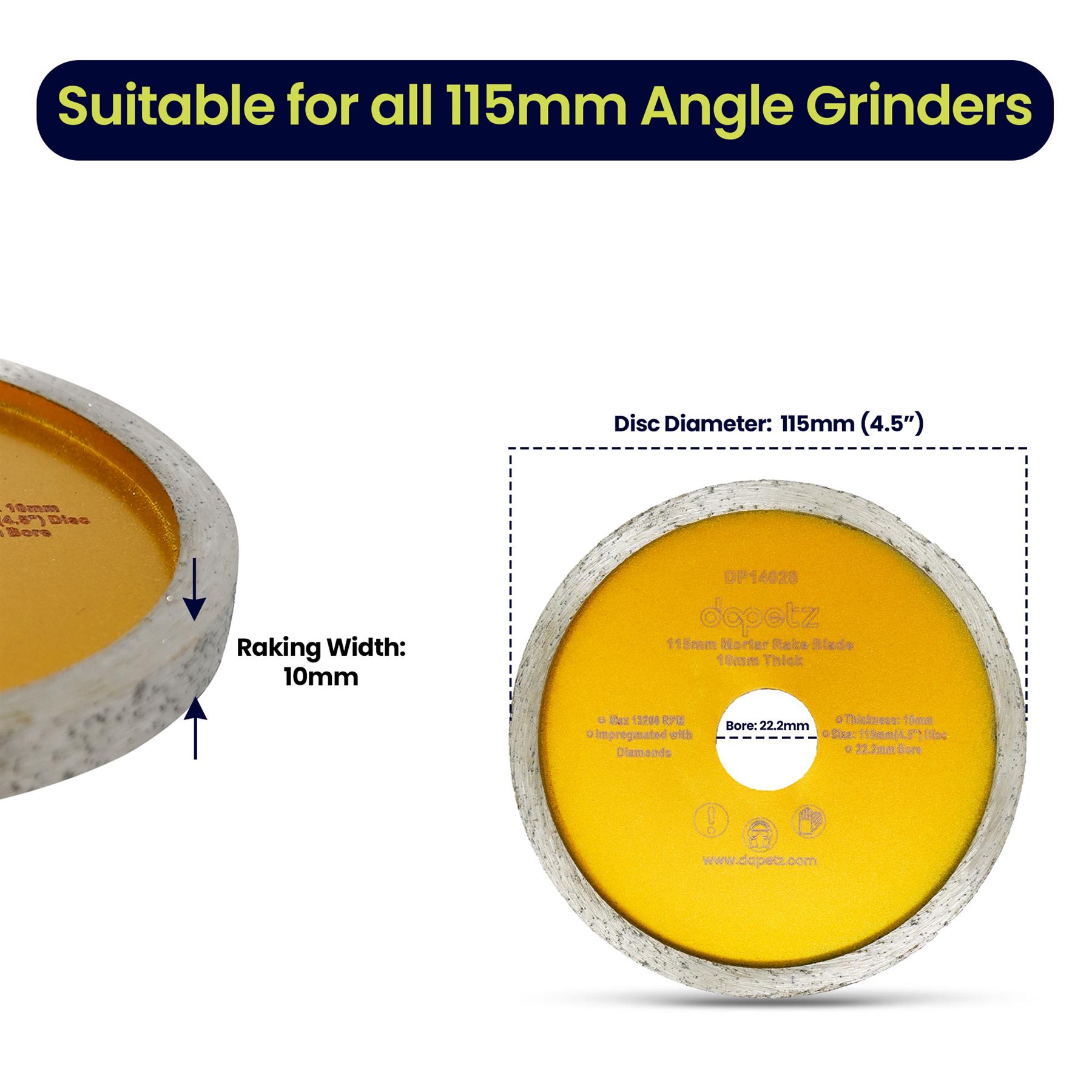 • Standard Angle Grinder Fit: 115mm (4.5″) diameter with a 22.2mm bore, compatible with most standard angle grinders.