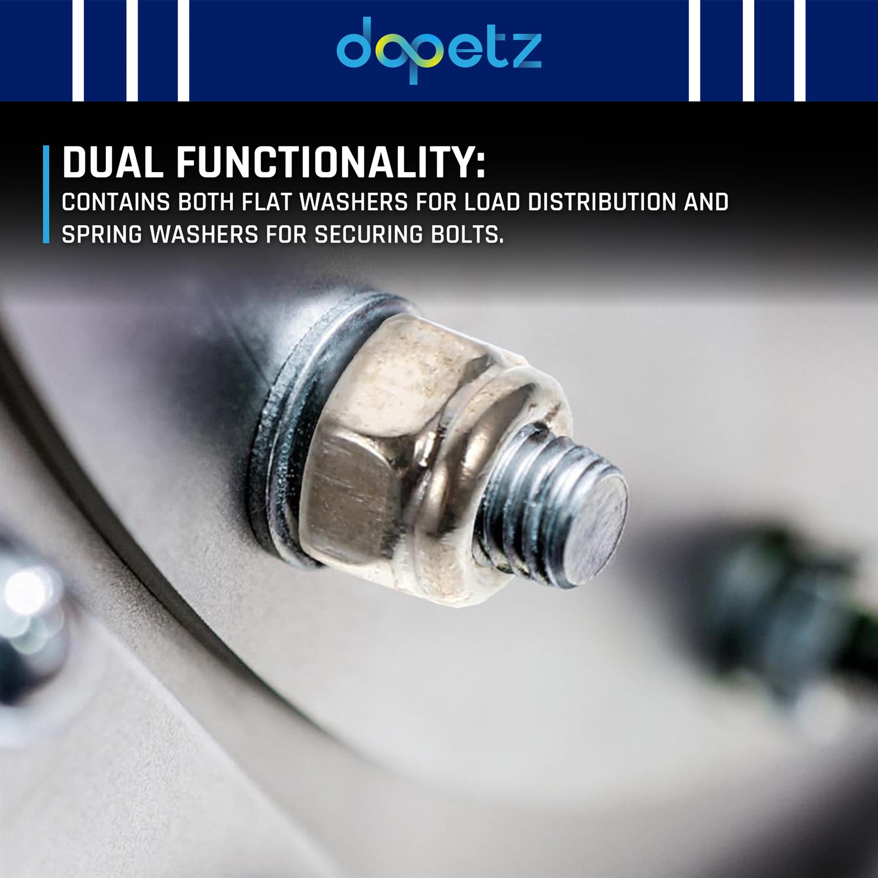 Dual Washer Functionality: Flat washers help distribute load evenly, while spring washers provide tension to prevent loosening.