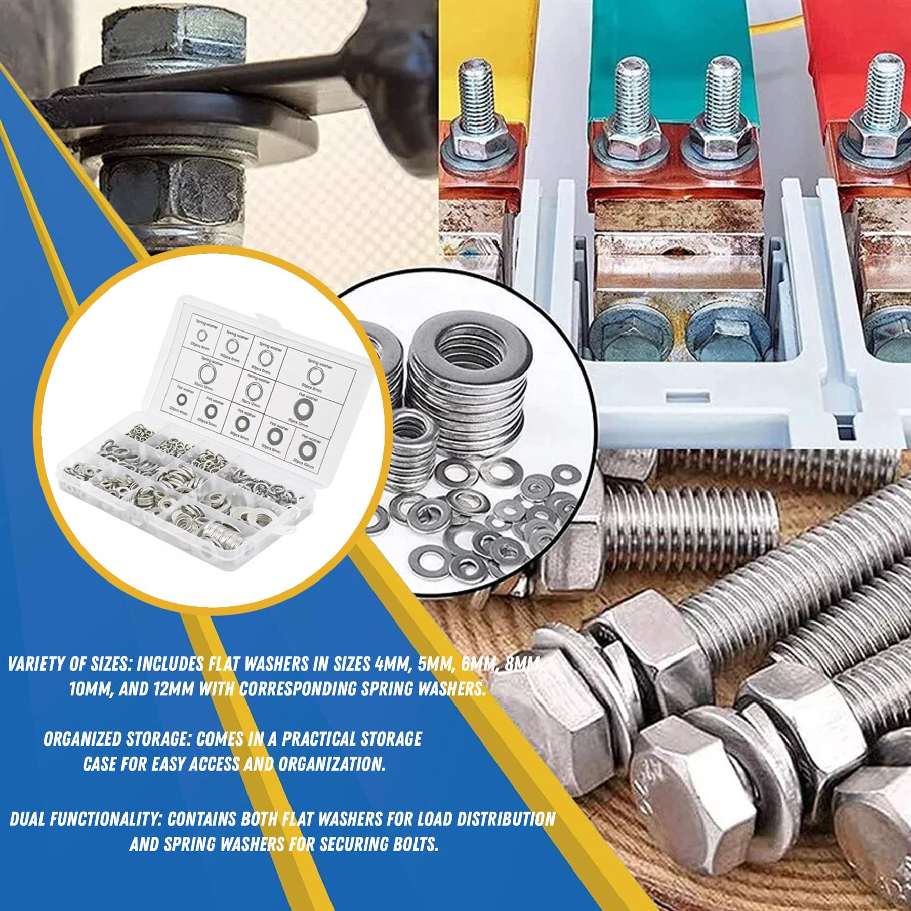 Multiple Metric Sizes Included: Flat washers in 4mm, 5mm, 6mm, 8mm, 10mm, and 12mm, each paired with matching spring washers.